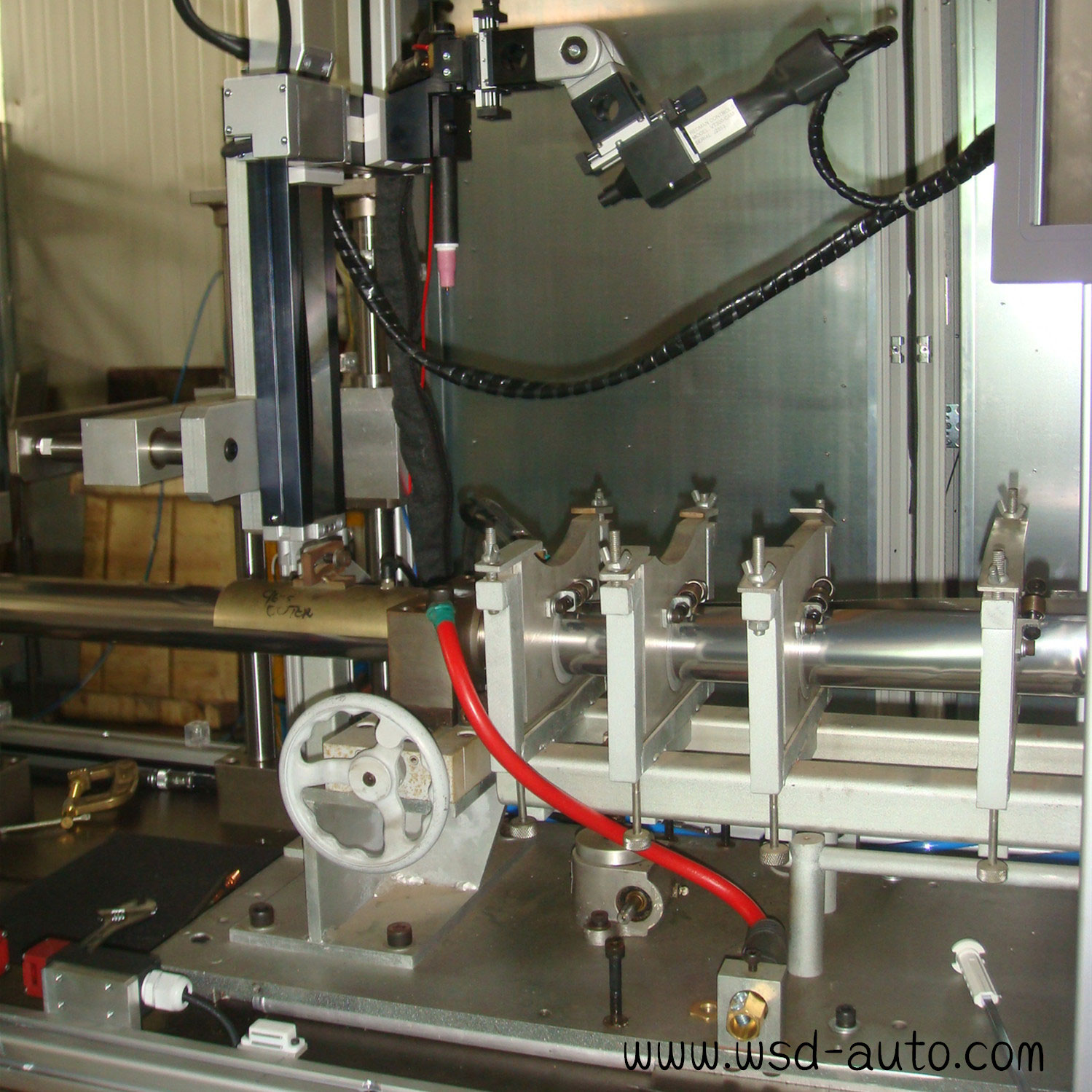 該設(shè)備用于將鋼帶彎曲焊接成鋼管。使用開卷機放卷,鋼帶通過清理、測量機構(gòu)進入成型工作臺,將鋼帶卷成筒狀,采用等離子焊或氬弧焊將卷縫焊合;焊接部采用視覺焊縫跟蹤,焊縫強度高,設(shè)備采用拖動系統(tǒng)后對制管提供動力,成品管進行跟隨定尺切割。設(shè)備操作簡單,正常情況下無需人工干預,設(shè)備啟動后按照設(shè)定的程序進行工作,有報警發(fā)生時可根據(jù)屏幕上的提示排除故障,該線已出口墨西哥